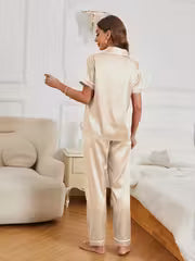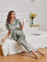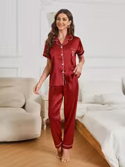 La finitura satinata dona al pigiama un aspetto elegante e raffinato, perfetto per chi cerca qualità e stile senza compromessi.